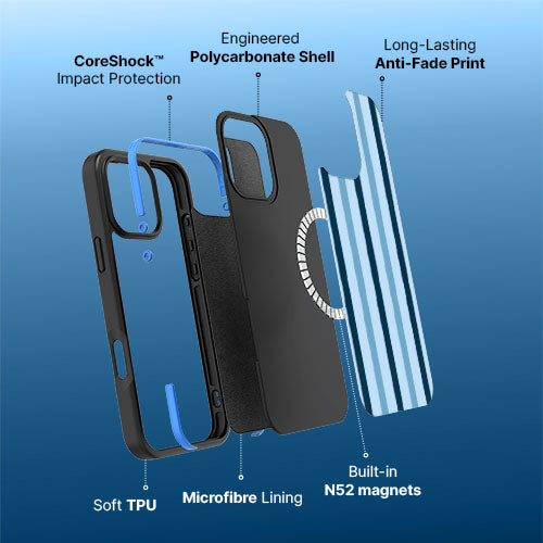 A considered construction brings comfort and strength together. Soft, grippy sides meet a rigid polycarbonate shell for confident everyday carry. Raised edges and CoreShock™ impact zones help guard your screen and camera, while long-lasting, industrial standard printing keeps the artwork vivid. Form and function, perfectly in sync.